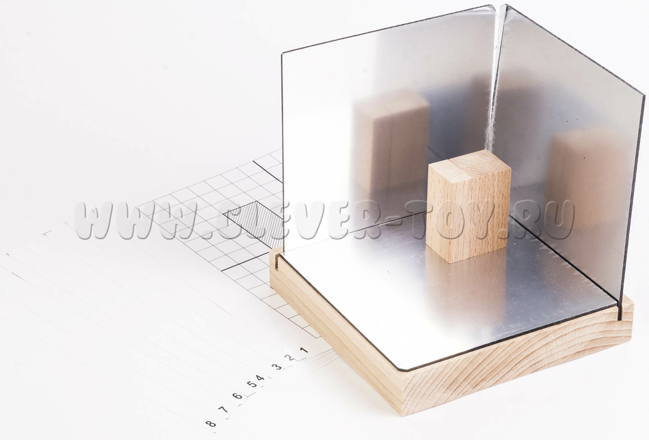 Вставьте зеркала в прорези основания скруглёнными углами наружу. На листах с чертежами изображены проекции фигур: вид спереди, сбоку и сверху. Ребёнок по чертежам строит из кирпичиков фигуры в зеркальном уголке. За одно занятие с ребёнком не рекомендуется строить более двух фигур.