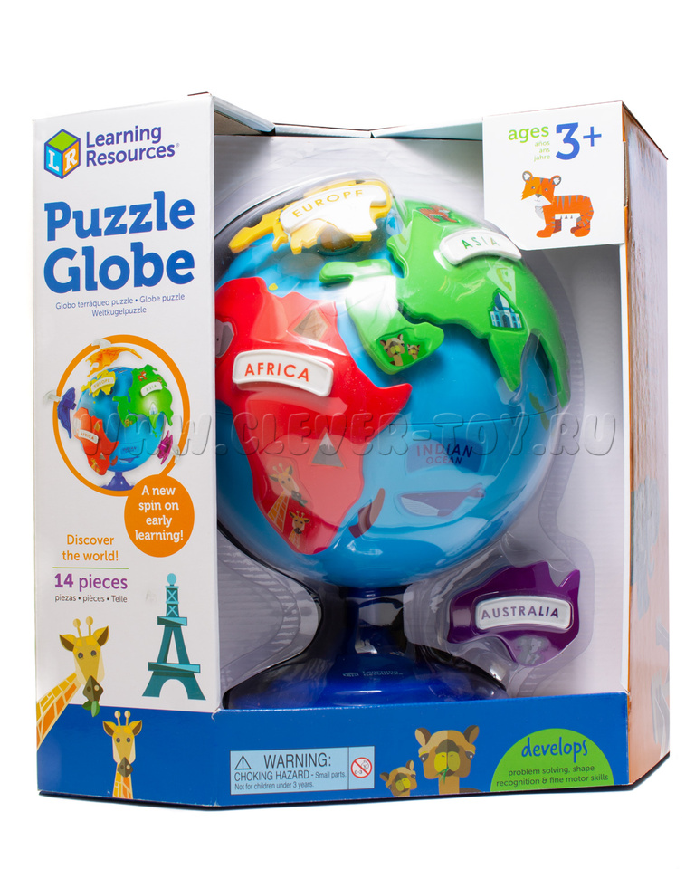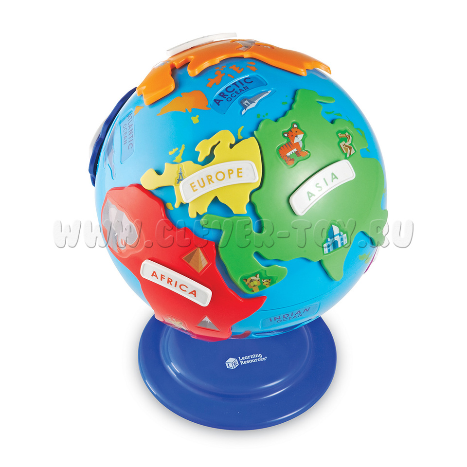 Знакомство с географией с помощью Глобуса-пазла, который показывает материки и животных, обитающих на них.