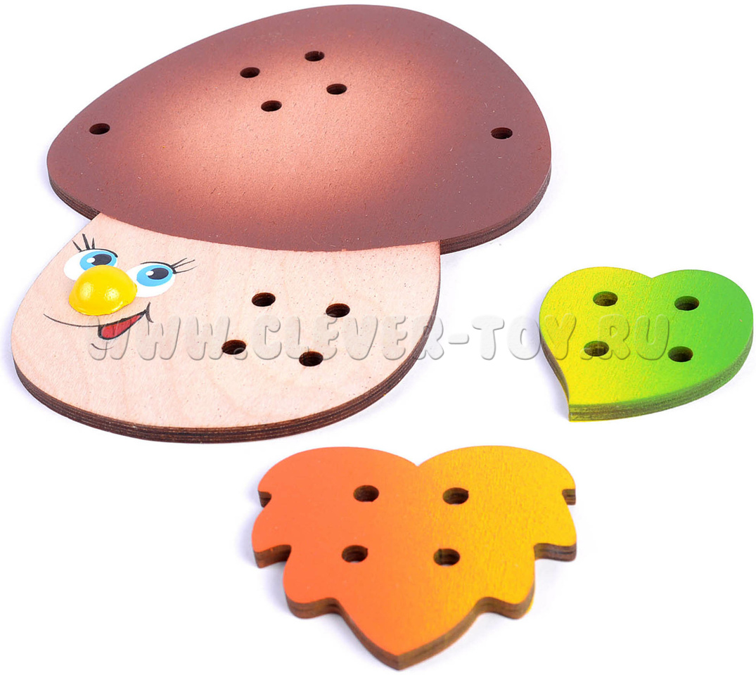 Шнуровка "Гриб Боровик" предназначена для развития мелкой моторики и координации движений в игровой форме. Ребенок узнает, как пришиваются пуговицы и научится делать стежки.