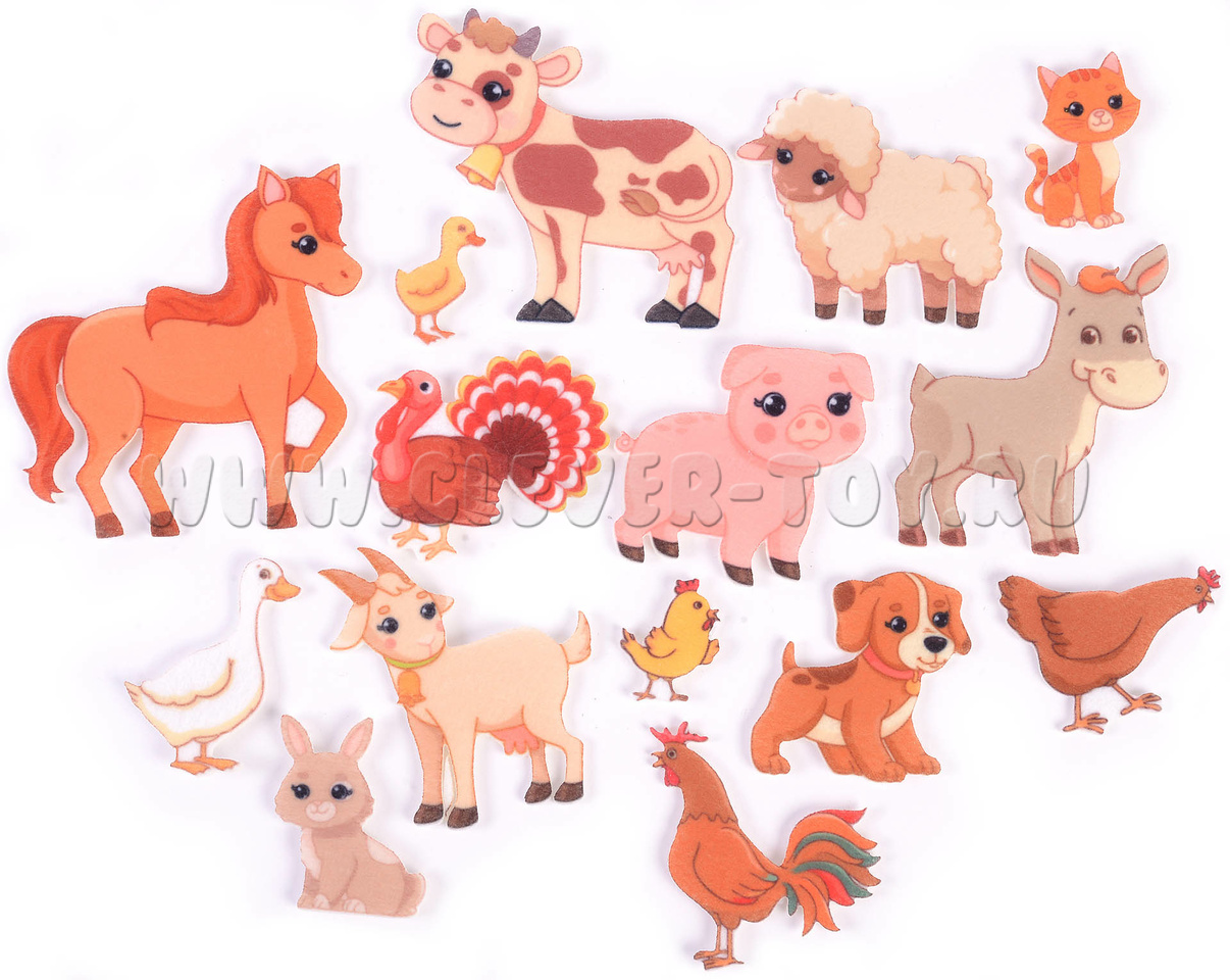 Перед глазами Вашего ребёнка раскинутся зелёные поля, холмы и луга, на которых весело и мирно гуляют самые разные домашние животные из мягкого фетра. Все фигруки животных находятся на липучках и легко крепятся к игровому полю.