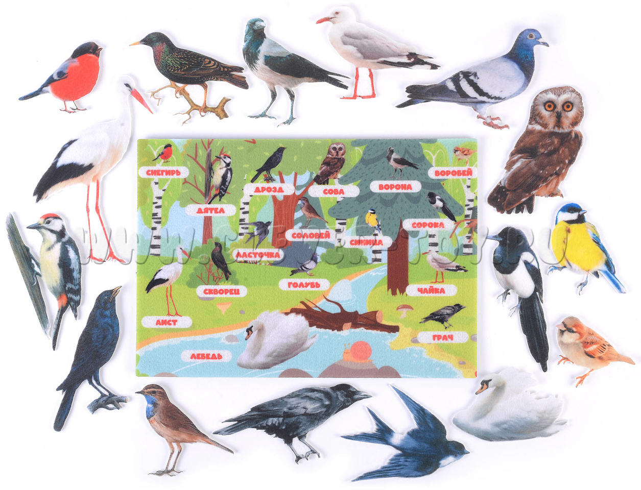 - Набор из 16 фигурок птиц на липучках (снегирь, дятел, дрозд, сова, ворона, воробей, ласточка, соловей, синица, сорока, скворец, голубь, чайка, аист, лебедь, грач)