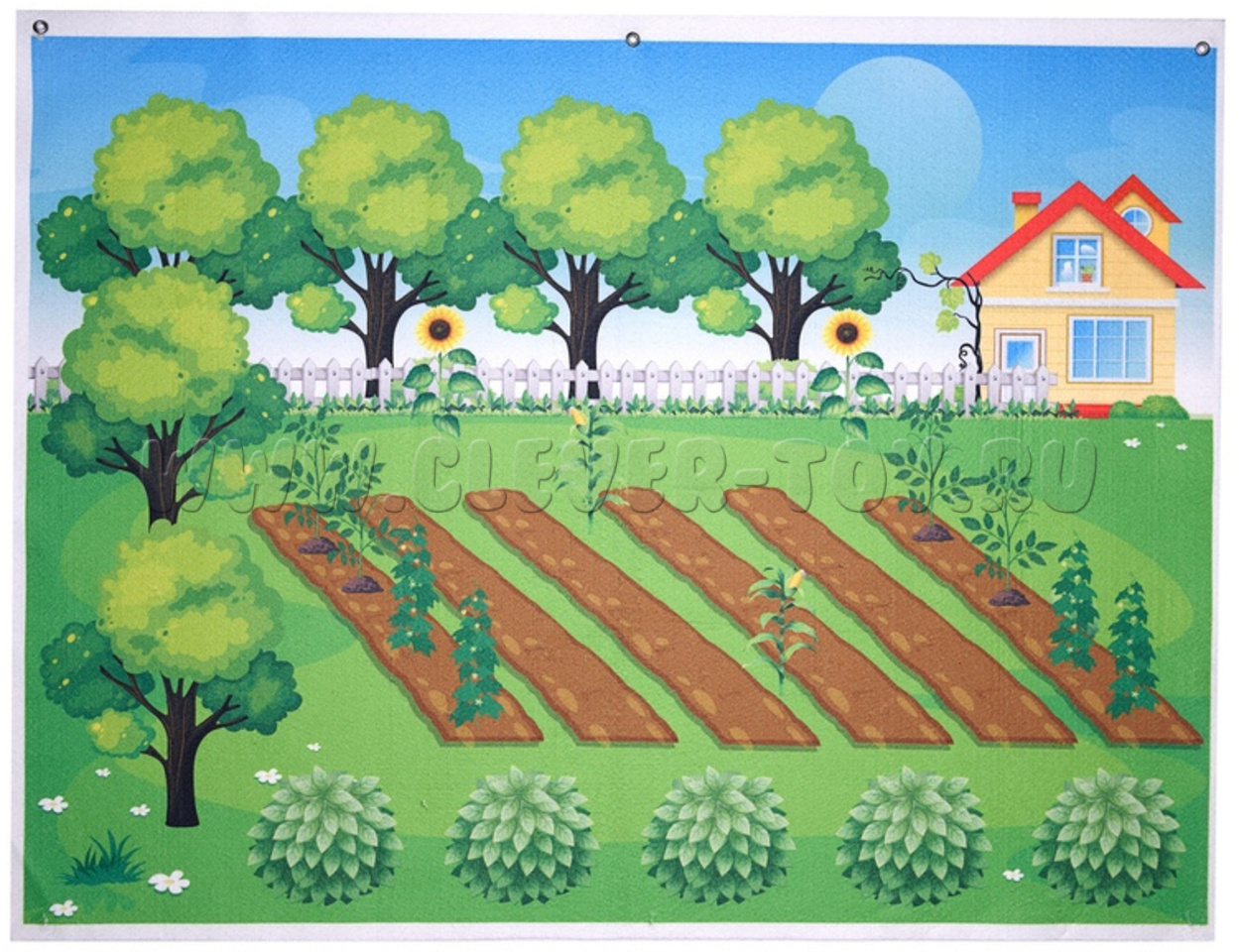 В комплект игры входит игровое поле размером 60x80 сантиметров с изображением домика, деревьев, кустов и грядок. Также в набор входят различные элементы с изображением фруктов, ягод и овощей.