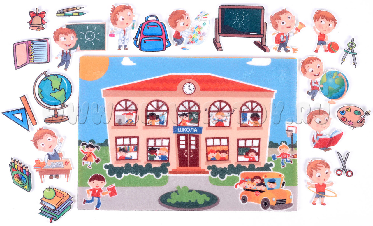 • 8 фигурок учеников с предметами-символами разных уроков – химия, физкультура, чтение, рисование и др.;