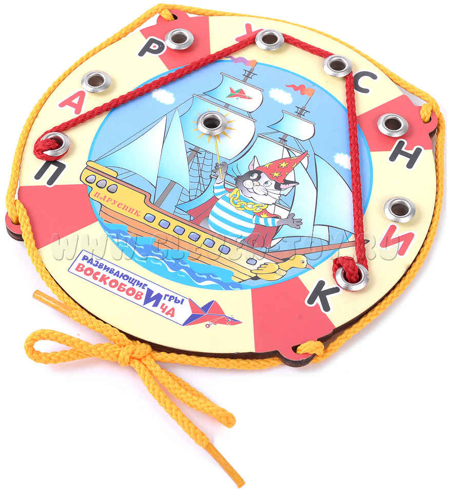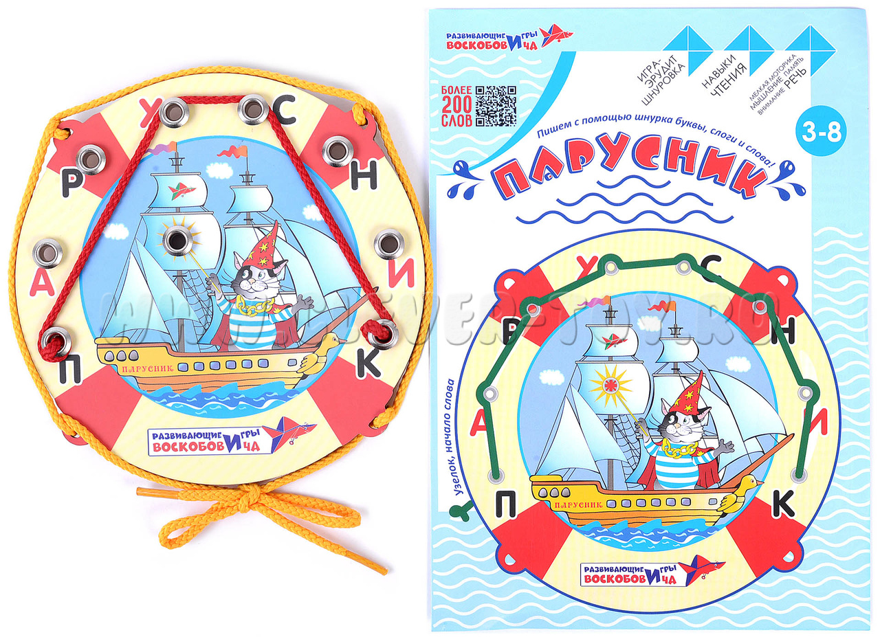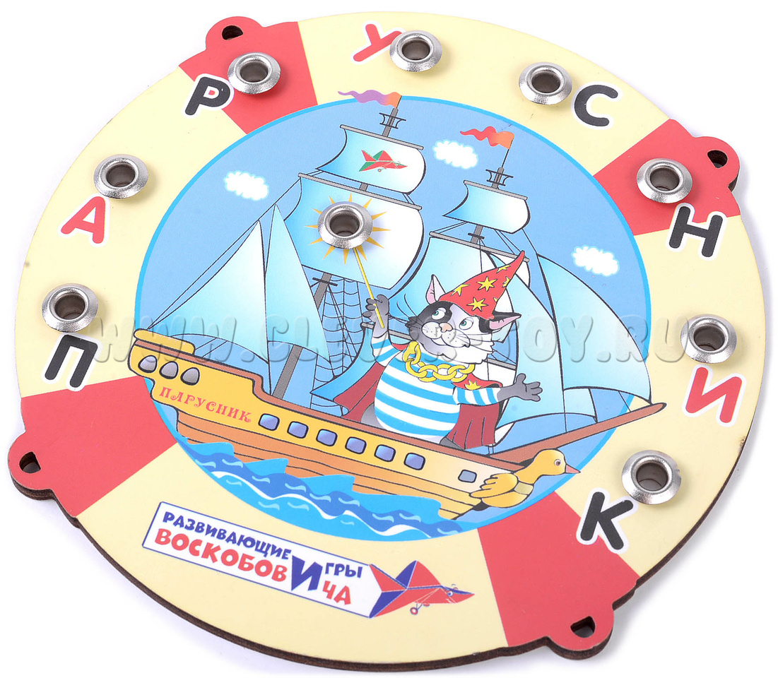 Описание игры: звездочка - является символом заменителем любой буквы; кнопка - шнурок может продеваться в кнопку, огибать ее или закручиваться вокруг нее; начало слова парусник - на рисунке показан пример написания слова шнурком; узелок - обозначает начало слова.