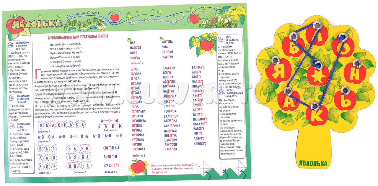 Ребенок продевает шнурок в отверстие, затем закручивает его вокруг последующих букв, и таким образом составляет различные слова. Символ "звездочки" означает любую букву. Начало слова Яблонька. Яблоко с буквой Я больше других яблок.