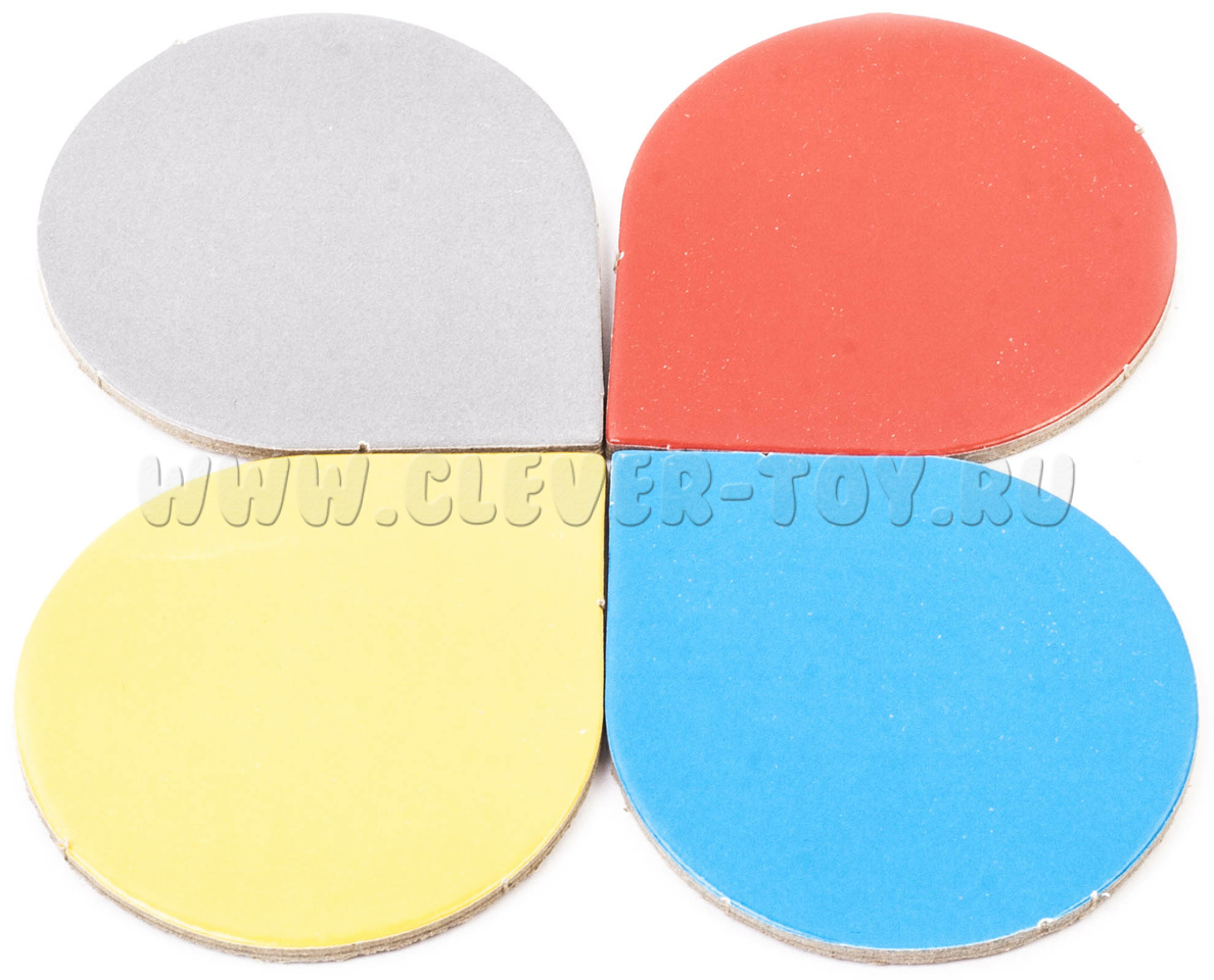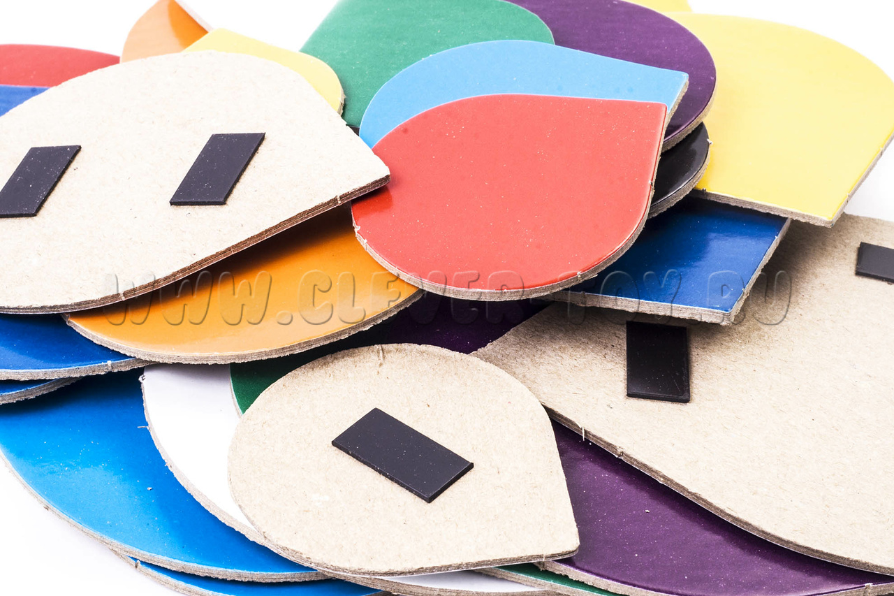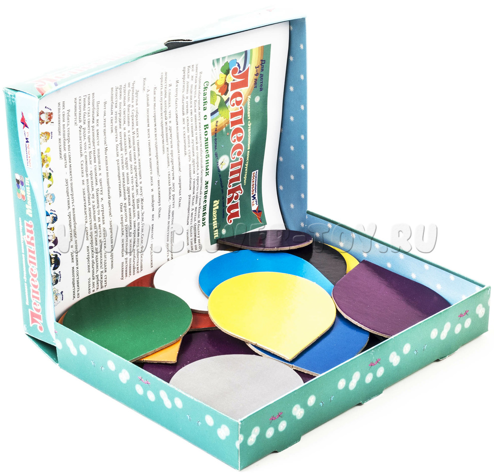 По выгодной стоимости вы получаете: 3 набора по 10 разноцветных лепестков на магнитах, радужные цвета + белый, серый и чёрный, отличающиеся по величине (большие, маленькие, средние). У каждого лепестка есть «носик», который определяет расположение детали в пространстве (повёрнута вправо, влево, вниз, вверх). Игровые элементы выполнены из картона, с обратной стороны снабжены магнитной лентой.