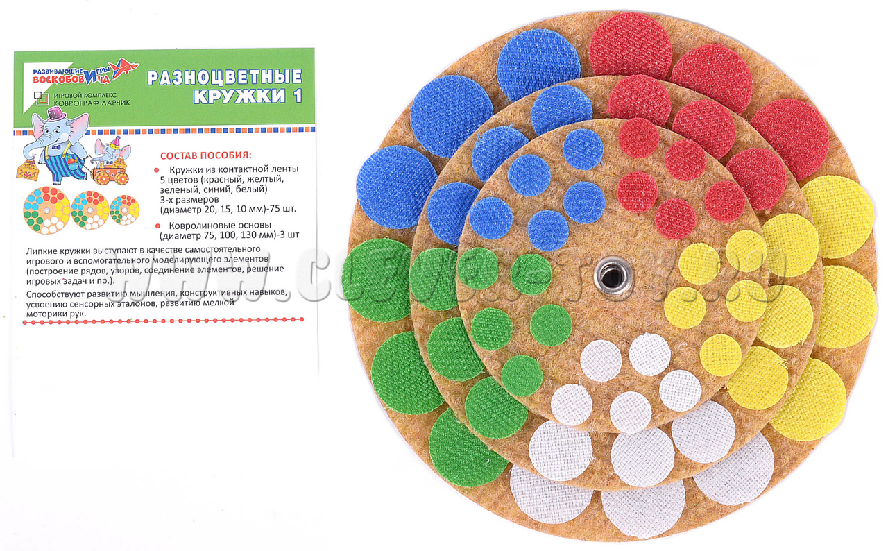«Кружки» выполнены из контактной ленты и имеют большую сцепляемость с поверхностью игрового поля развивающей среды «Коврограф Ларчик». Их можно использовать в качестве: