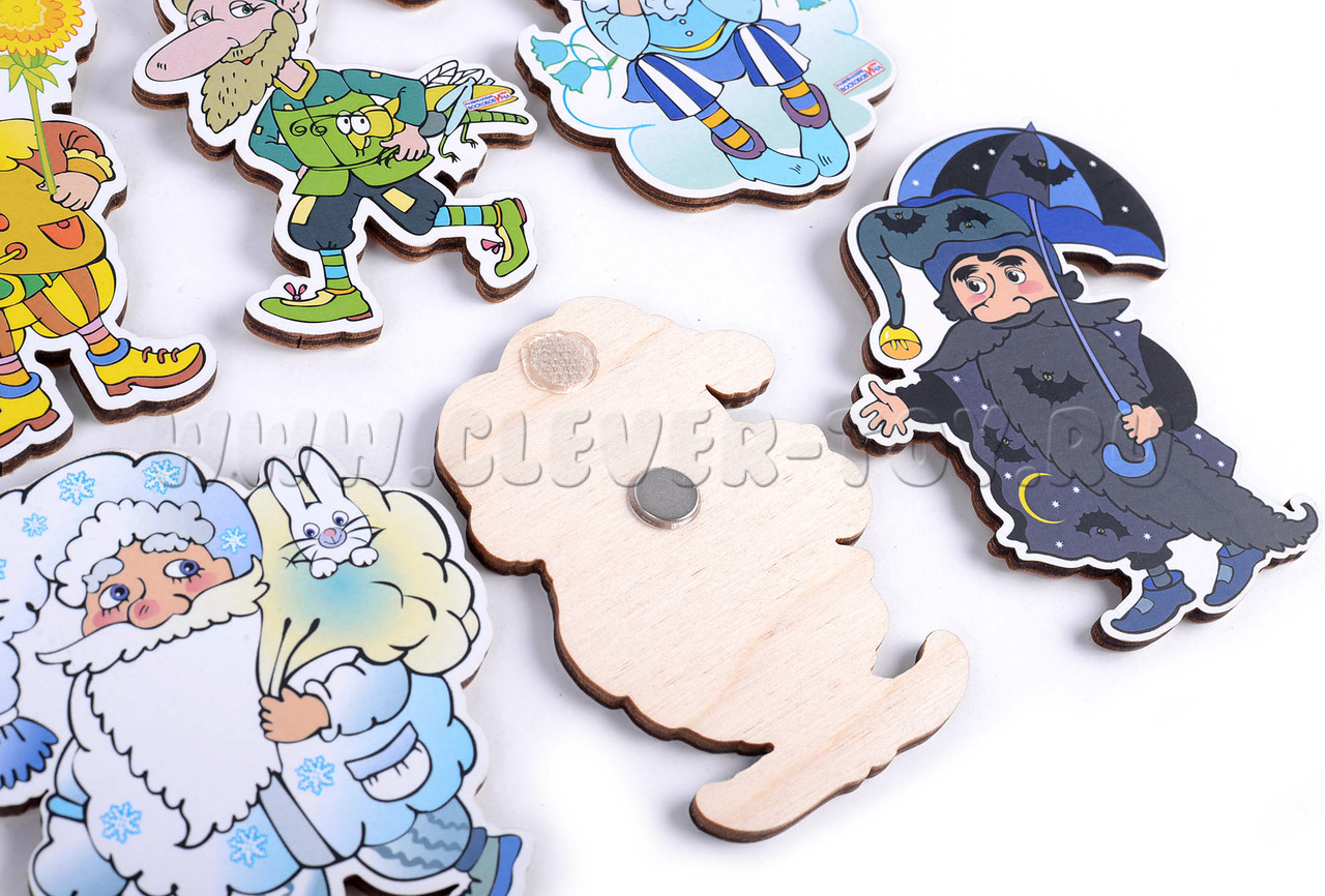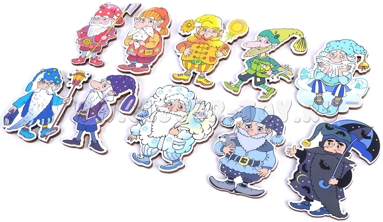 1. Гномы (10 шт), контурные фигуры (фанера, цв. плёнка); Крепление: липучка (контактная лета), магнит;
