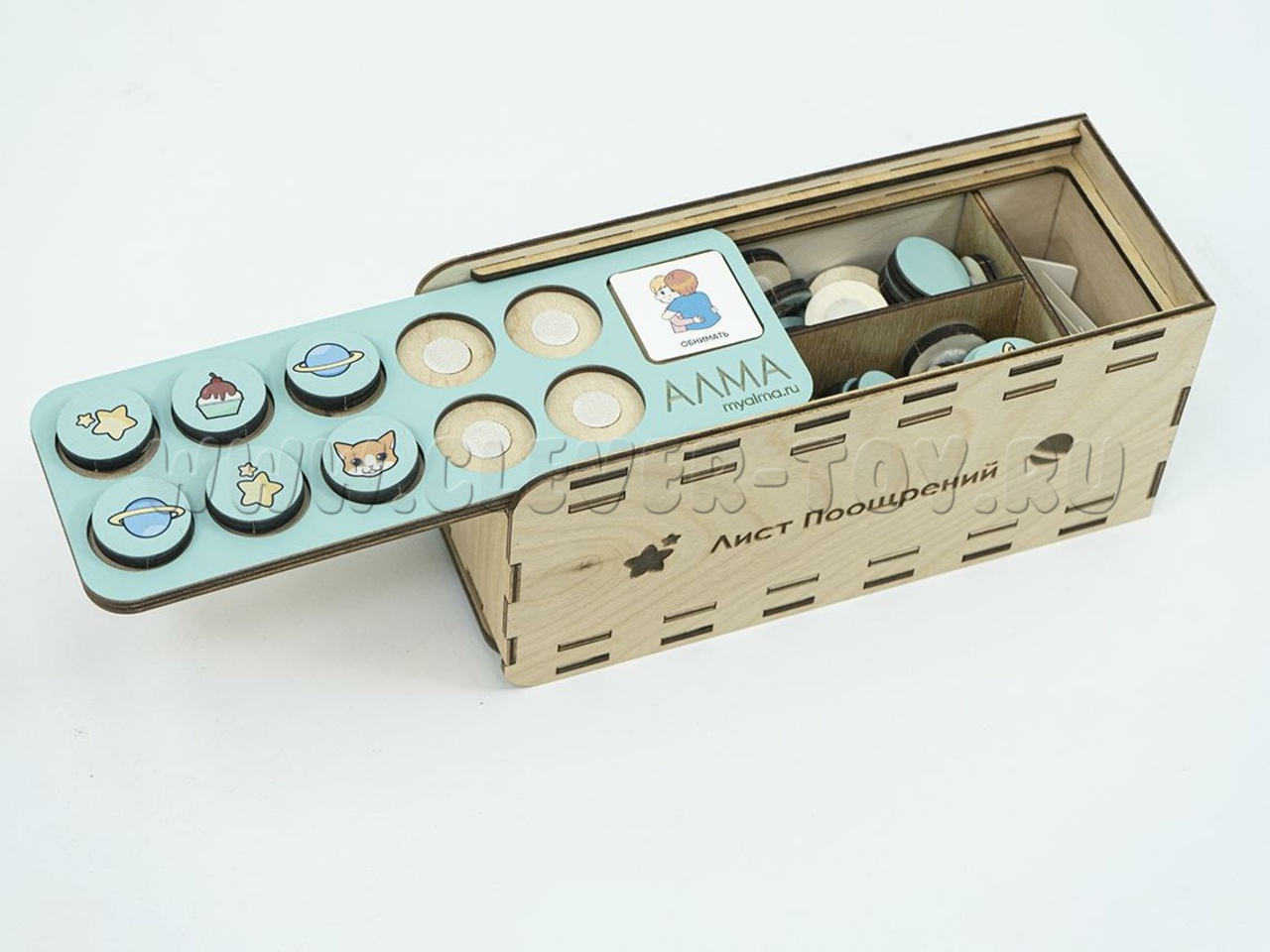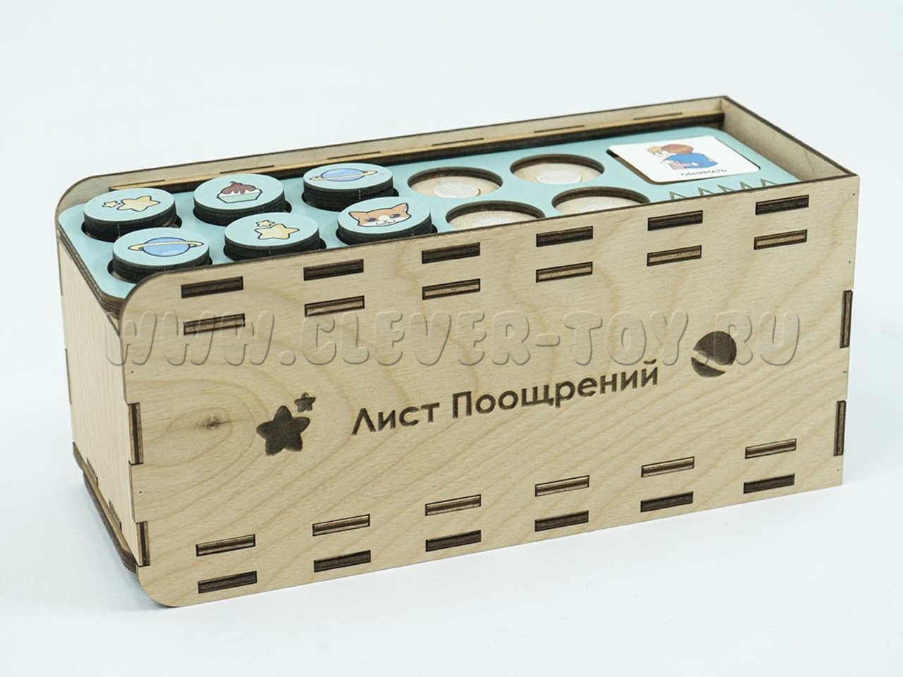 Представляет собой ящичек, с 2 съемными крышками. На крышке 10 углублений под поощрительные жетоны и 1 место крепления мотивирующей карточки. Внутри ящика набор жетонов на липучках, в том числе 90 жетонов с тематическими рисунками (машинка, сладости, животные, звёздочки), по 10 штук каждого типа, и 10 жетонов без рисунка, а также мотивирующие карточки из системы PECS/ПЕКС.