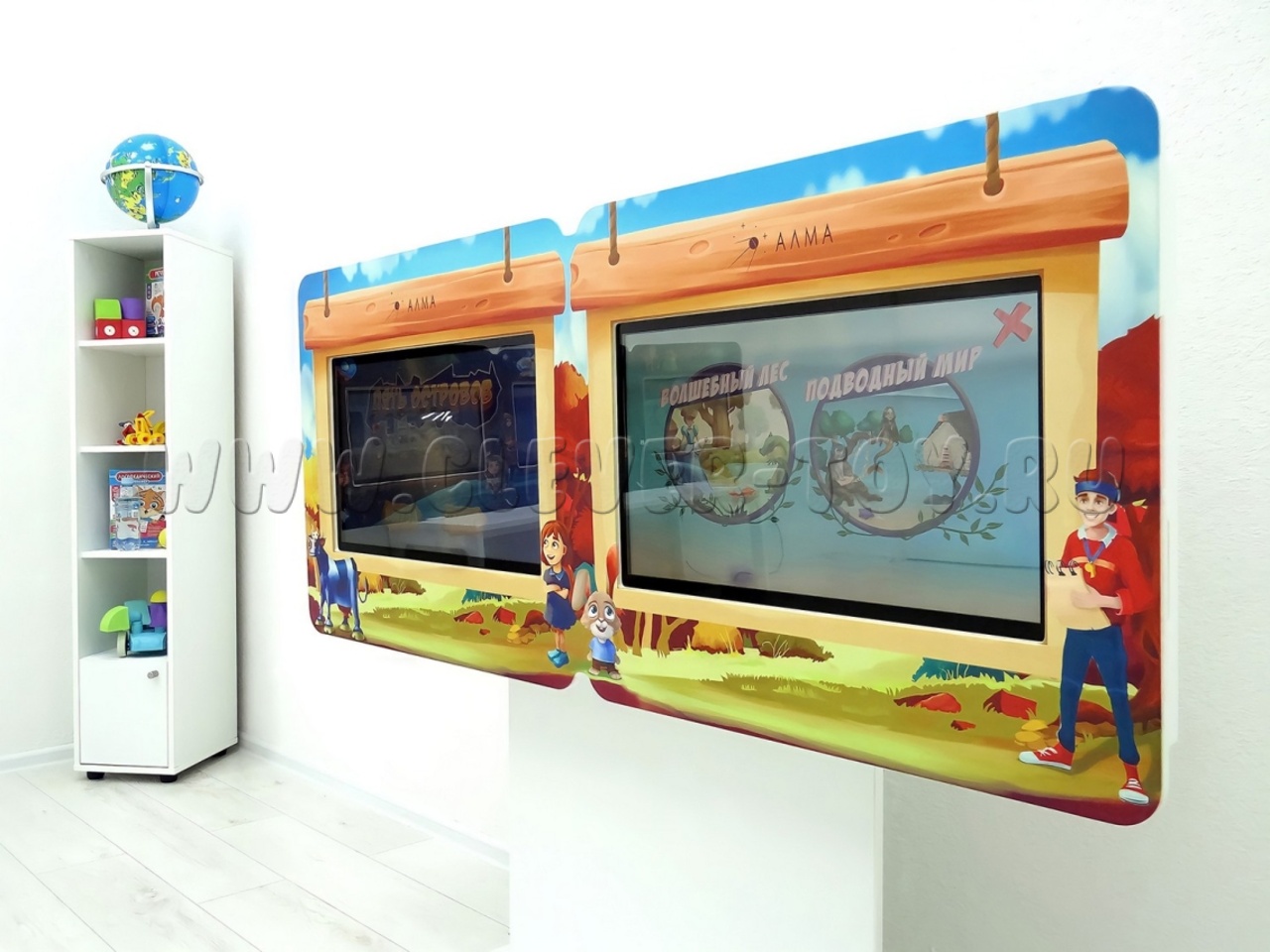 1. ДВЕ интерактивных настенных панели по 25 дюймов в одном корпусе, украшенным детскими картинками и персонажами из программного обеспечения (Full HD, мультитач 10 касаний, intel, 4 гб RAM, SSD 120 гб, win 10);