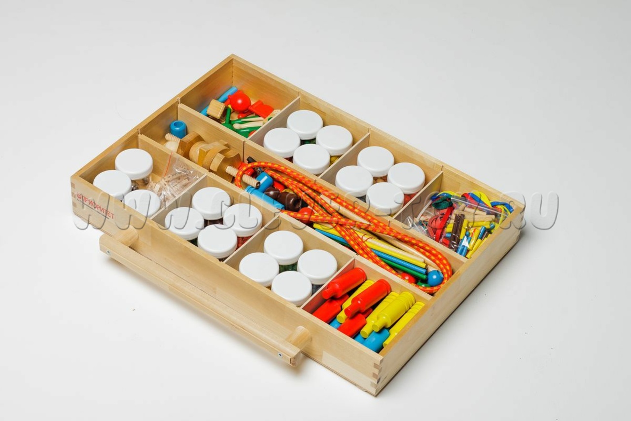 Более 1000 мелких деталей: резиночки, бусины, шнурочки, цилиндрики, набор для завинчивания, игральные кости. На доске с отверстиями ребёнок выкладывает узоры, соединяет элементы, повторяет заданный рисунок. Развивает мелкую моторику и хватательные движения.
