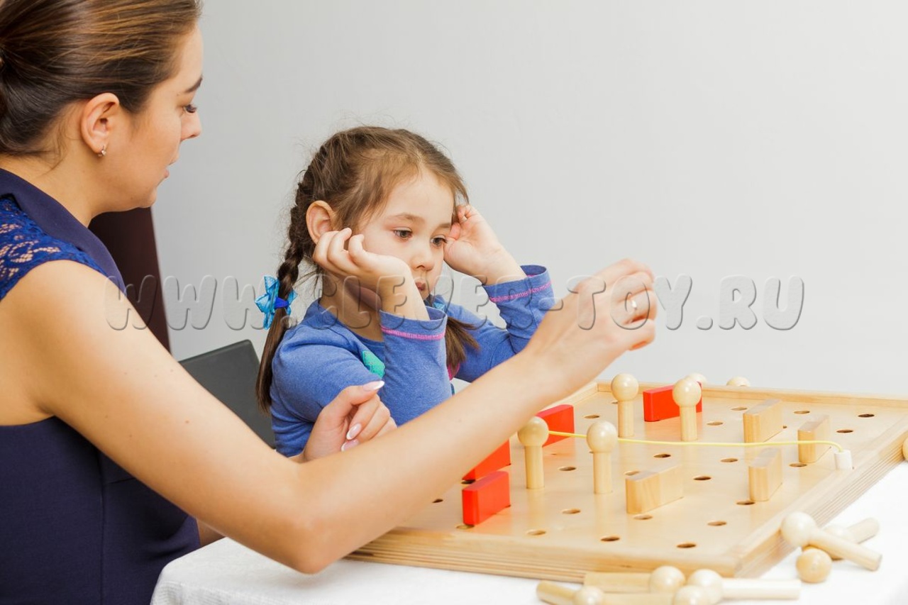 Модуль 5: педагог выкладывает узор из цветных резинок и штырьков - ребёнок повторяет его на второй части доски.