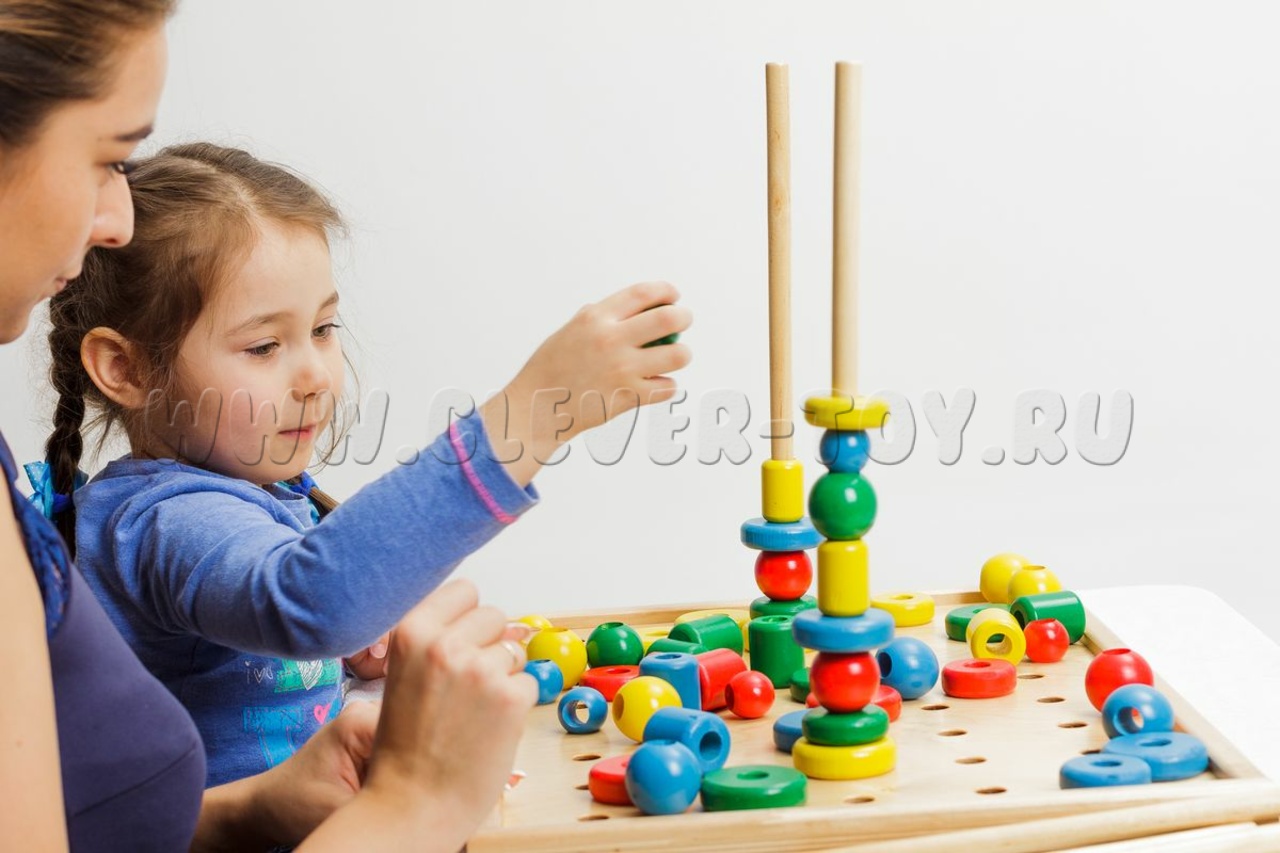 Бусины разной формы с крупными отверстиями, стержни, верёвочки, соединители. Игры: нанизывание по образцу, по цвету/форме, сбор объёмных конструкций. Развивает логику, воображение, наблюдательность.
