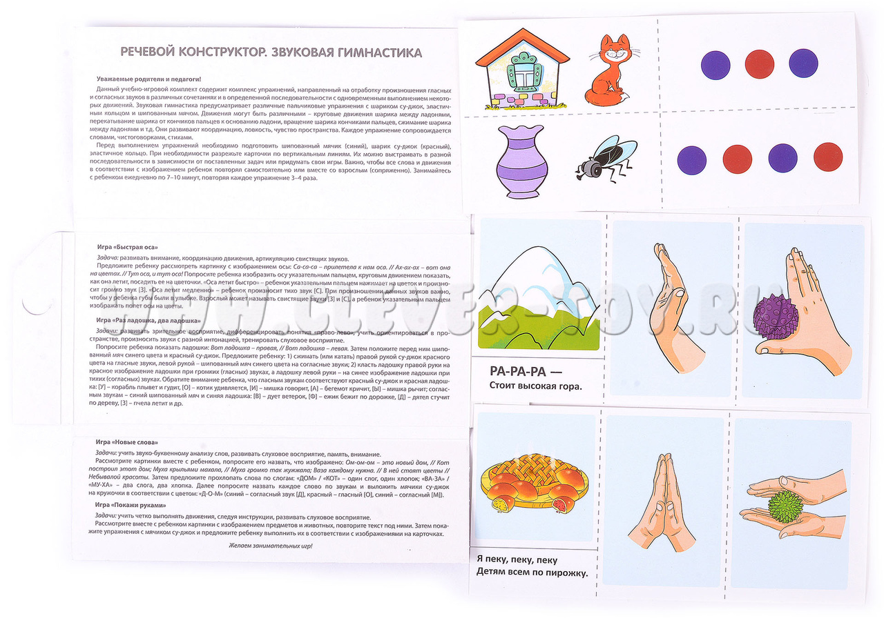 Комплект "Речевой конструктор. Звуковая гимнастика" представляет собой 12 листов, состоящих из 36 карточек и 4 игр. Ребенок научится совершать пространственные действия, произнося одновременно звуки, слоги, слова, а также воспроизводить цепочки движений, развивая моторные навыки, зрительное восприятие и слухомоторную память.