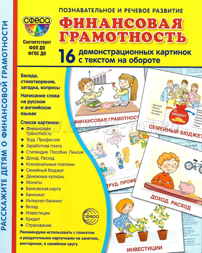 Комплект "Финансовая грамотность" состоит из 16 цветных демонстрационных карточек (картинок)и адресован детям, желающим овладеть основами финансовой грамотности. Дошкольники и младшие школьники ознакомятся с финансовыми терминами и их значением, научатся различать финансовые операции, овладеют важными теоретическими навыками, а главное - смогут использовать полученные знания в повседневной жизни.