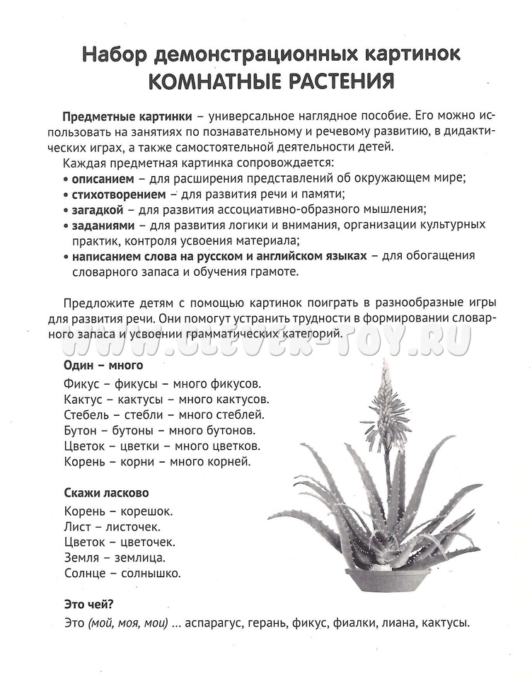 Комплект картинок "Комнатные растения" состоит из 16 цветных демонстрационных карточек (картинок) и адресован детям и их родителям, желающим познакомиться с популярными комнатными растениями, как ухаживать за ними, чем полезны для человека.