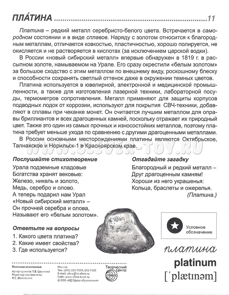 Комплект "Полезные ископаемые" состоит из 16 цветных демонстрационных карточек (картинок) и адресован детям и их родителям, желающим познакомиться с полезными ископаемыми, добываемыми на территории нашей страны.