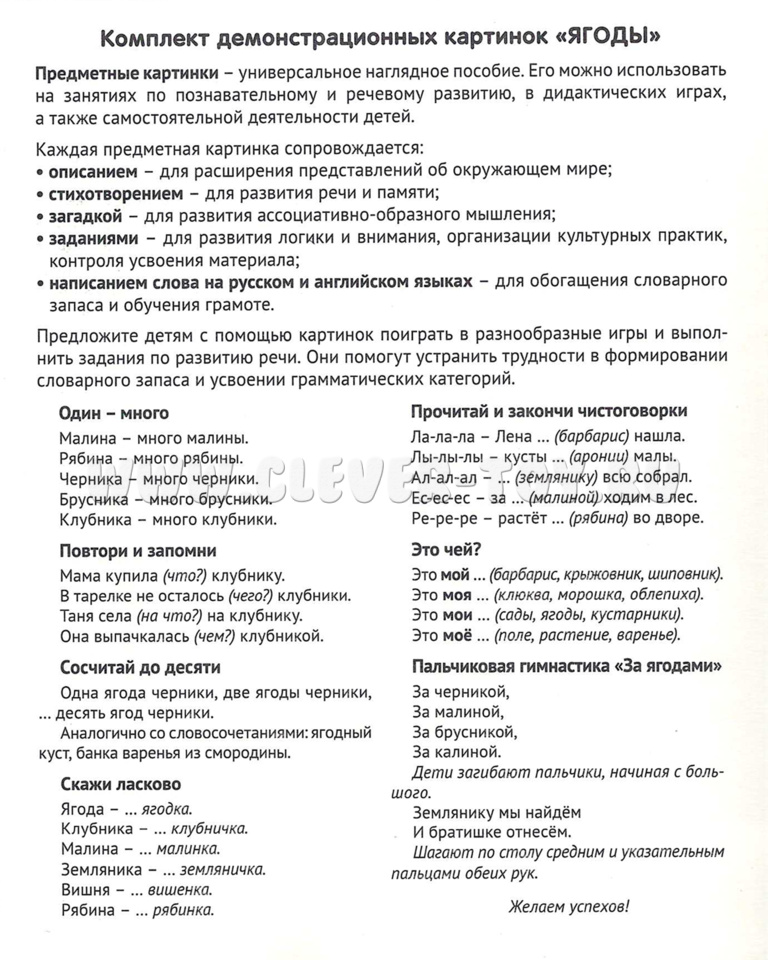 Комплект "Ягоды" состоит из 16 цветных демонстрационных карточек (картинок) и адресован детям и их родителям, желающим познакомиться с полезными ягодами, растущими на территории нашей страны.