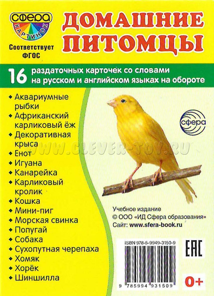 На каждой карточке на лицевой стороне размещено цветное изображение домашнего любимца, а на обратной – название на русском и английском языке с транскрипцией.