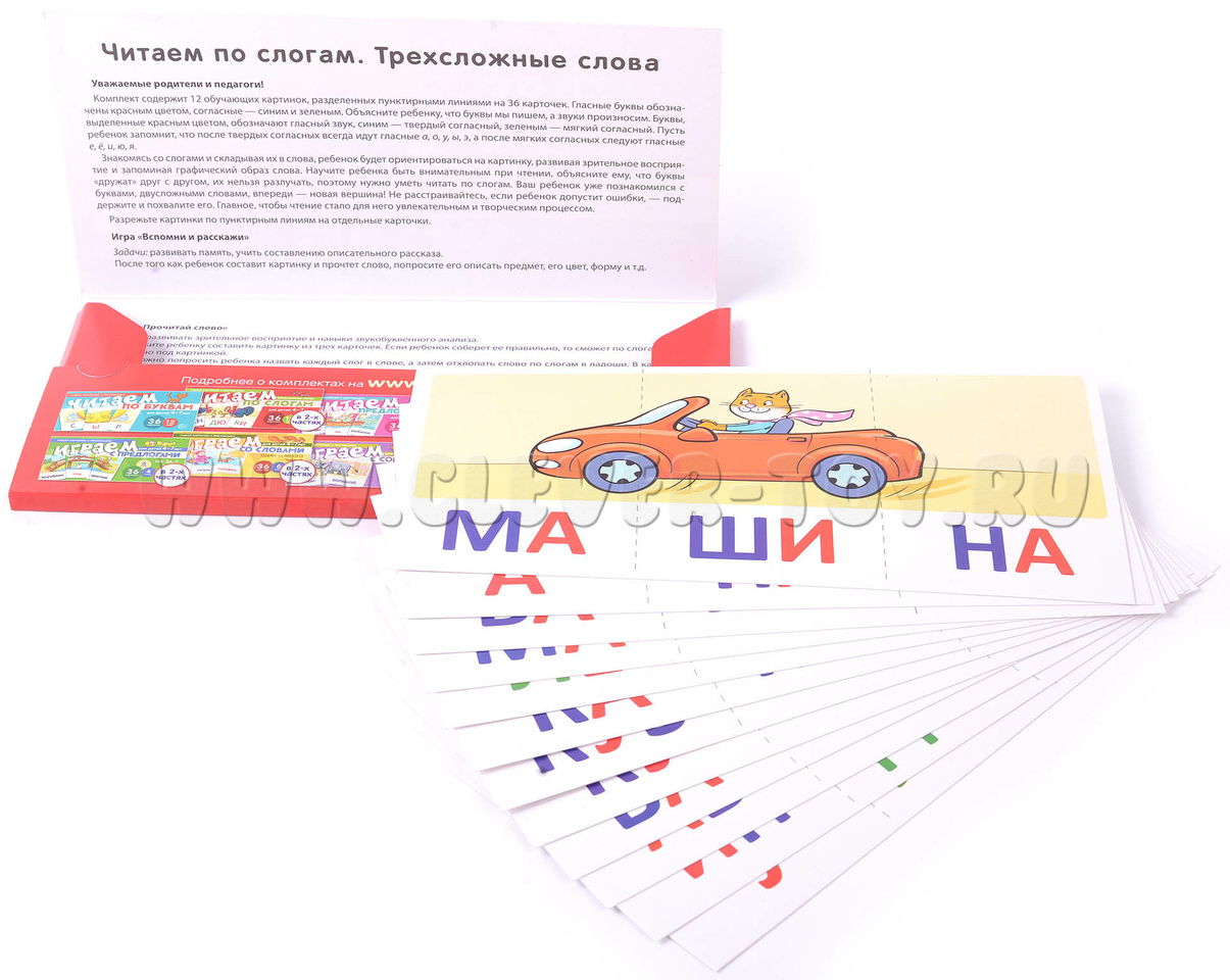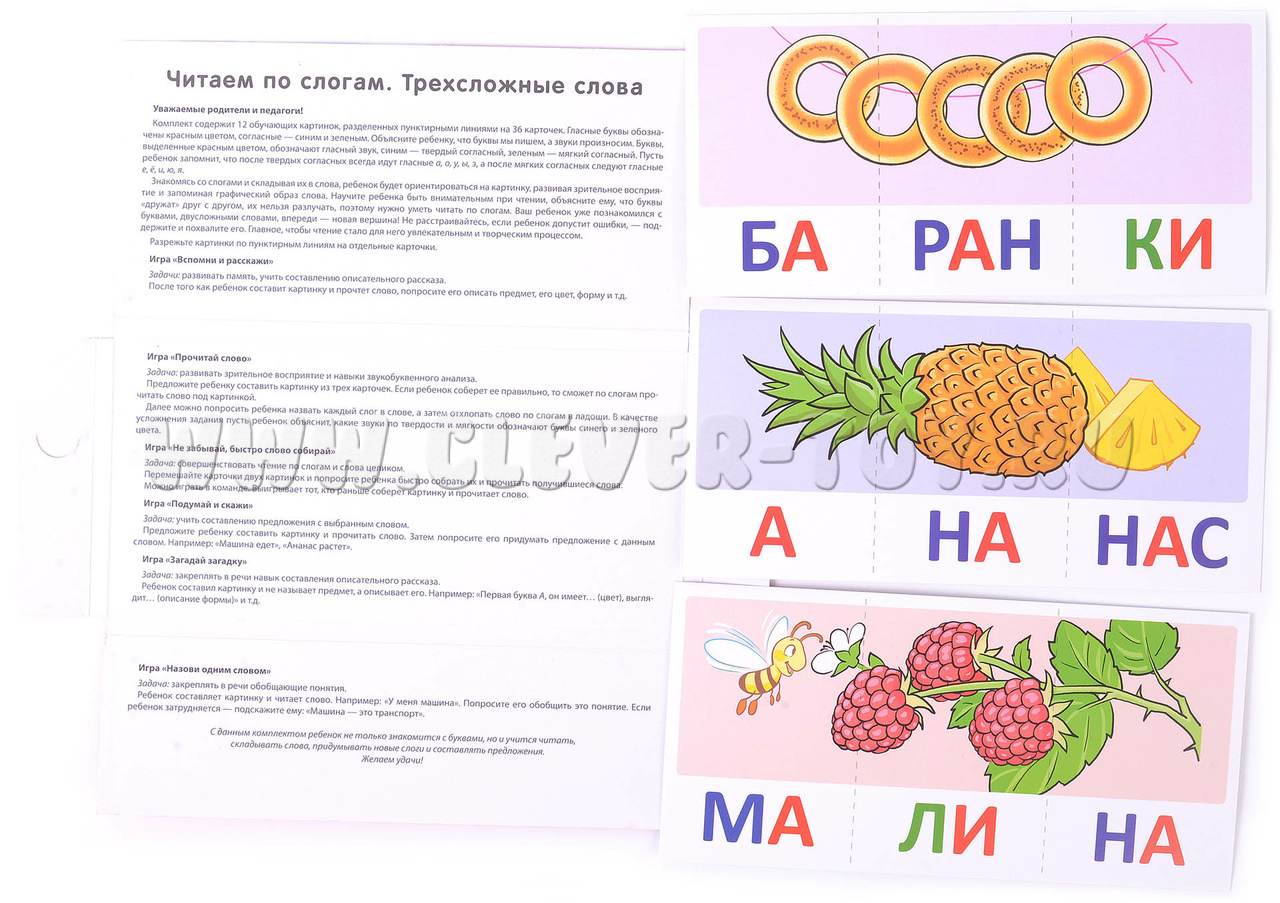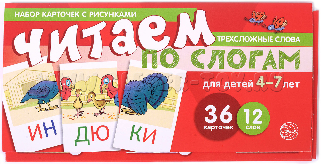 Набор карточек с рисунками. Читаем по слогам. Трехсложные слова. Для детей 4-7 лет
