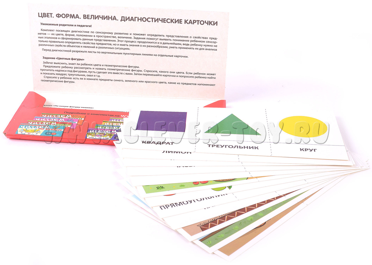 Обучающий комплект "Цвет. Форма. Величина" представляет собой 12 листов, состоящих из 36 карточек и 4 заданий, и является тематическим продолжением диагностического комплекта «Эмоции», выпущенного издательством "ТЦ Сфера". Он познакомит детей 4-7 лет с разными эмоциональными состояниями человека, разовьет коммуникативные навыки и правильное звукопроизношение. Ребенок в игровой форме научится определять, называть и описывать эмоции.