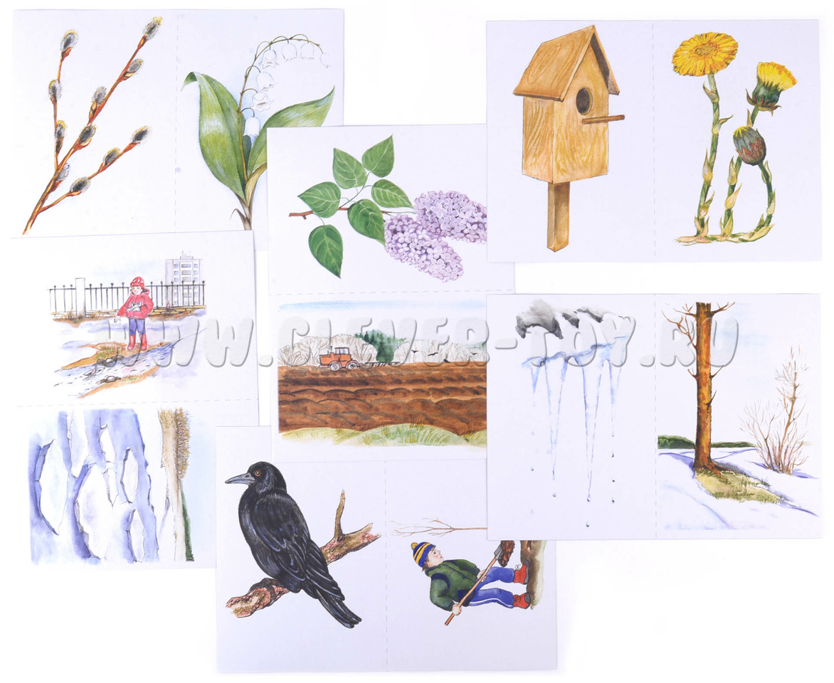 - предметные картинки с признаками весны - 12 шт. (6 разрезных листов А4);