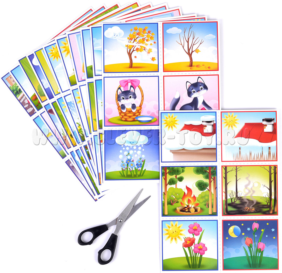 Для начала взрослый может дать ребёнку уже готовые пары карточек и попросить описать изображения на них. Сначала то, что нарисовано на карточке в синей рамке, а потом — в красной. Ребёнок должен понять связь между изображениями и объяснить её. Например, «одуванчик облетел, потому что был сильный ветер».