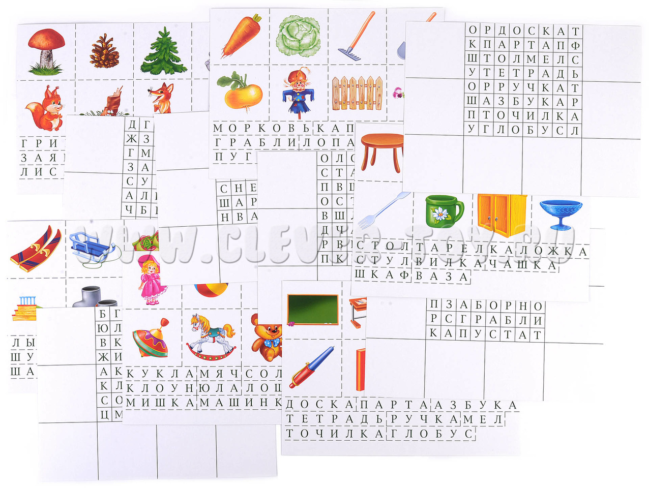 Раздайте детям карточки с таблицами и предложите найти в таблице слова и прочитать их. Затем покажите карточки с предметами. Пусть дети выберут картинки, на которых есть названия предметов из таблицы. После этого нужно закрыть слова в таблице карточками со словами.Попросите детей назвать темы, на которые они собрали картинки («Зима», «Огород» и так далее).