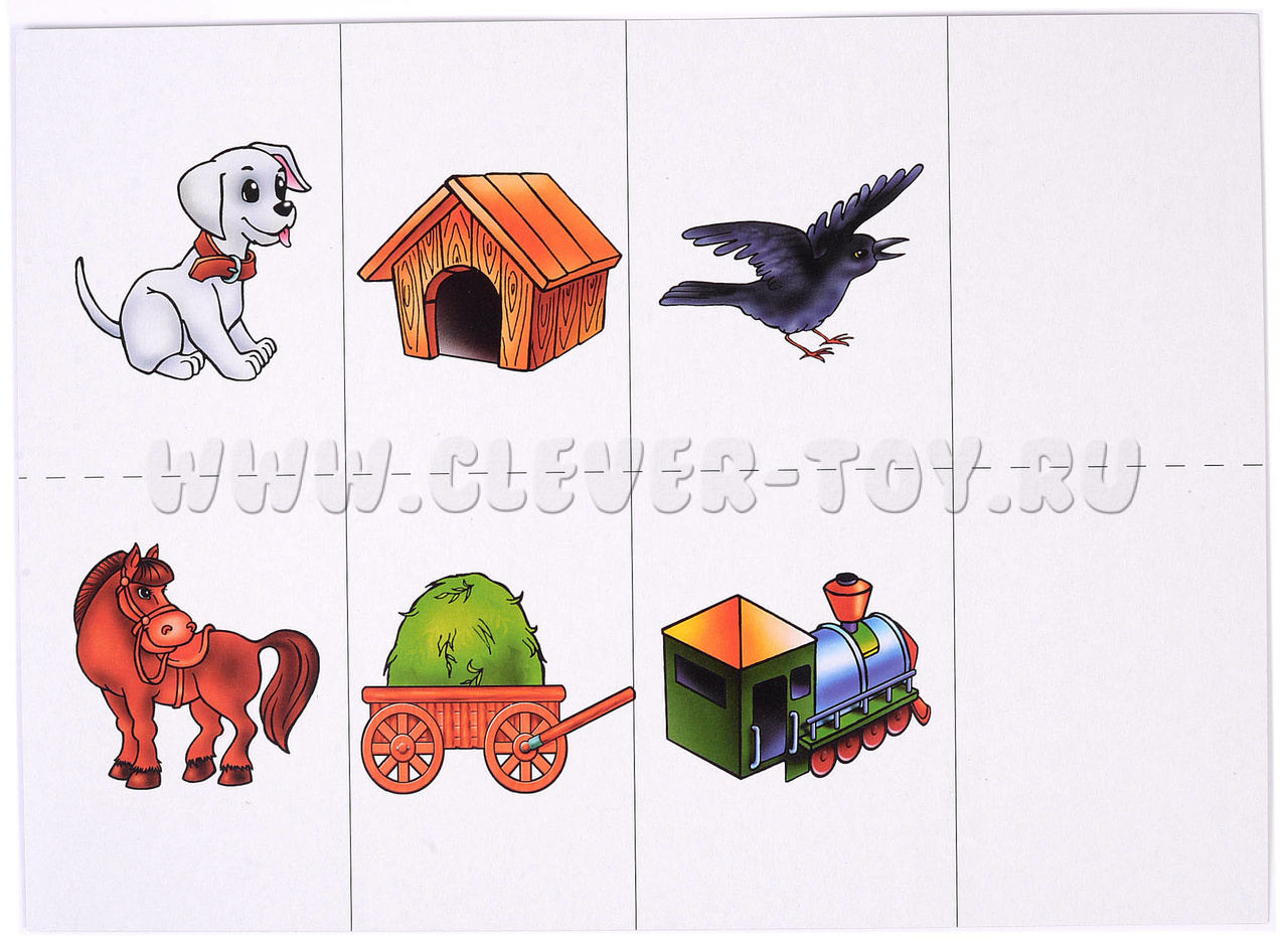 В наборе папка для хранения и 10 карт: 16 неоконченных смысловых цепочек и 16 картинок-окончаний. Перед началом игры разрежьте карты по пунктирным линиям. Предложите малышу найти закономерность и подобрать подходящую к цепочке картинку, выложив ее на пустую клетку карты. Попросите ребенка аргументировать свой выбор.