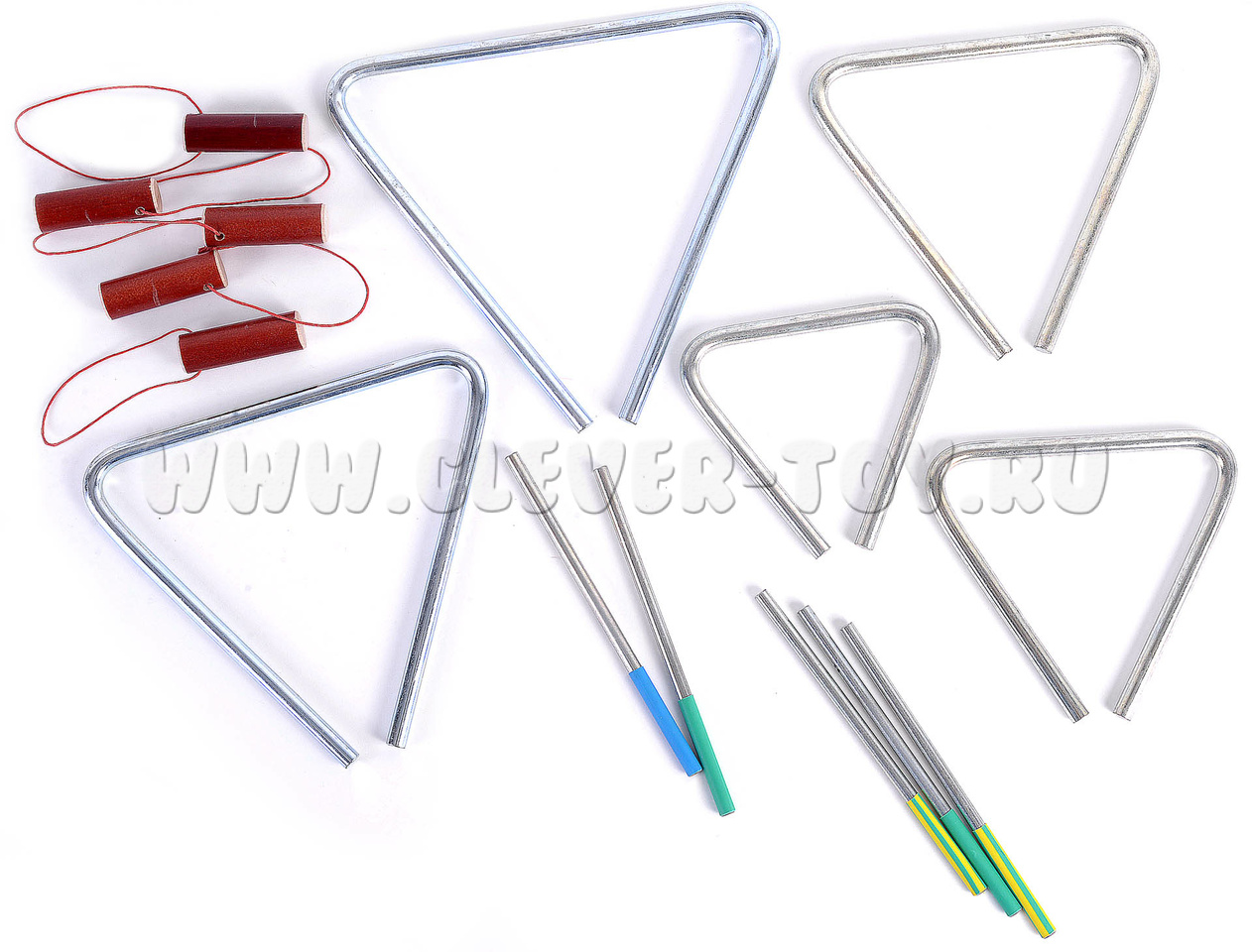 5 музыкальных треугольников (длина стороны - 10, 12, 14, 16, 18см) с качественной тембральной окраской, благородным и певучим звуком (до 20 секунд).