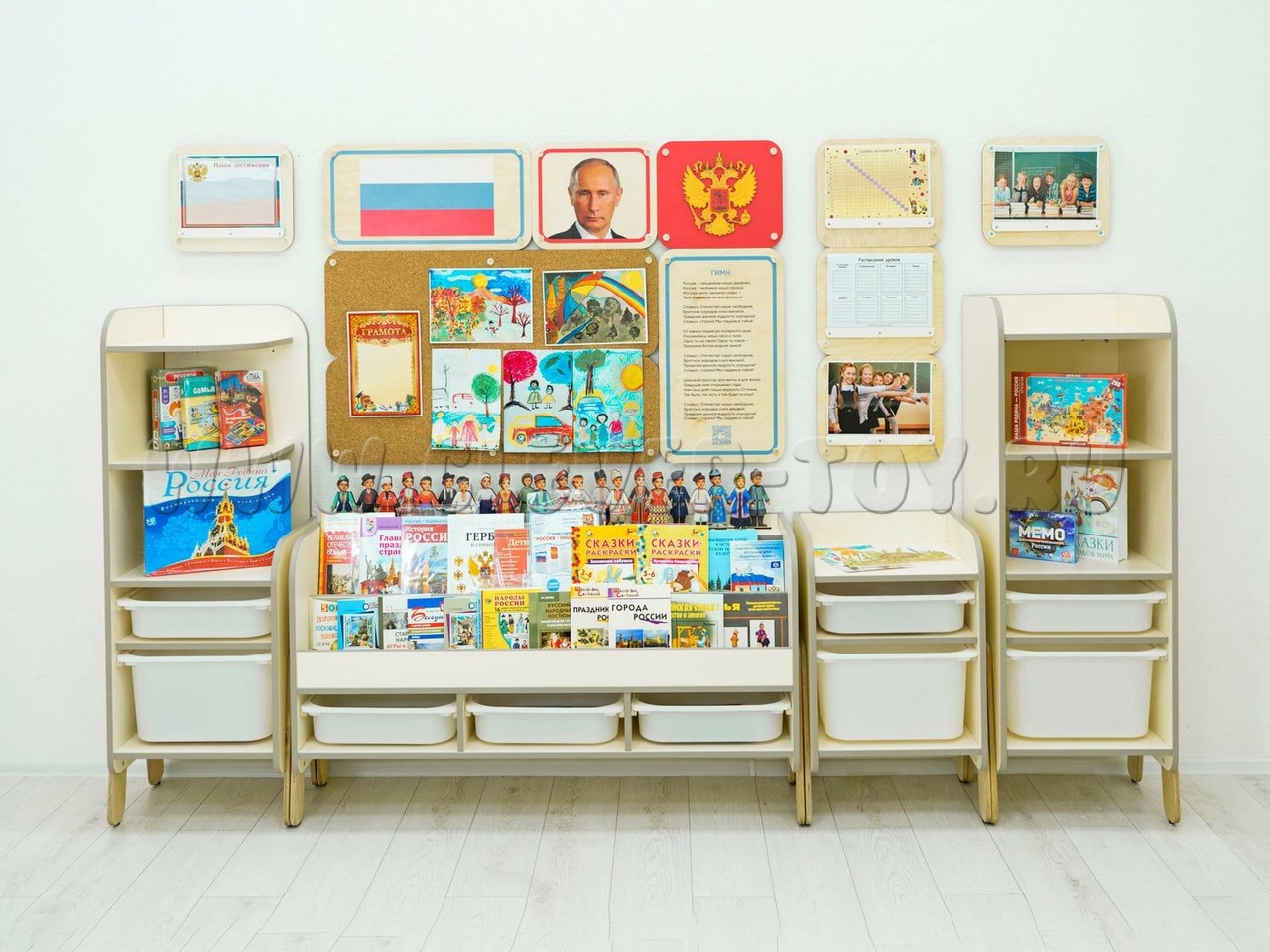 Уголок по патриотическому воспитанию для группы детского сада. Содержит основную символику РФ, панели для размещения работ воспитанников, набор разборных кукол, контейнеры для размещения книг. Соответствует требованиям ФГОС 3.