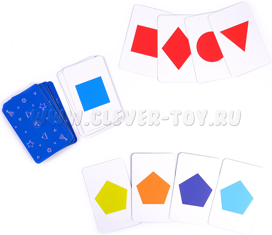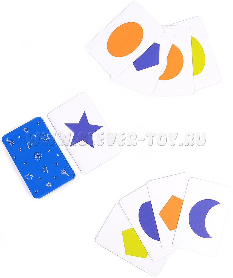 В набор входит инструкция с правилами игры и 32 карточки с изображениями 8 геометрических фигур разных цветов.