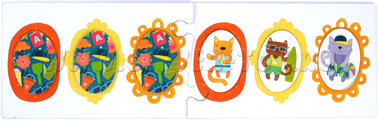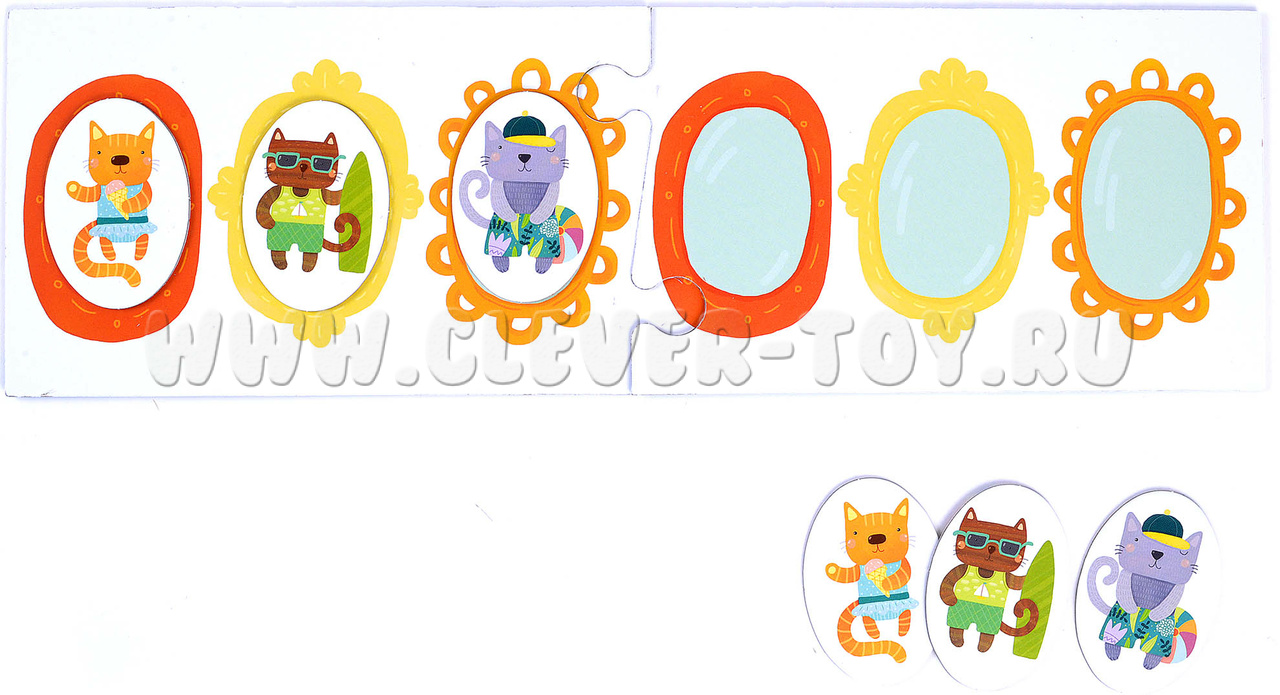 1. Игра на поле с рамками. Составное игровое поле разделено на 2 части, в каждой из них по 3 портретные рамки. Распределите фишки с котятами поровну так, чтобы и у вас, и у ребенка на руках оказались одинаковые комплекты. Выложите на своей части поля любую случайную последовательность из 3 фишек. Предложите малышу выложить такую же на своей половине игрового поля. Игру можно усложнить, если предложить ребенку запомнить составленную вами последовательность и воспроизвести ее по памяти;