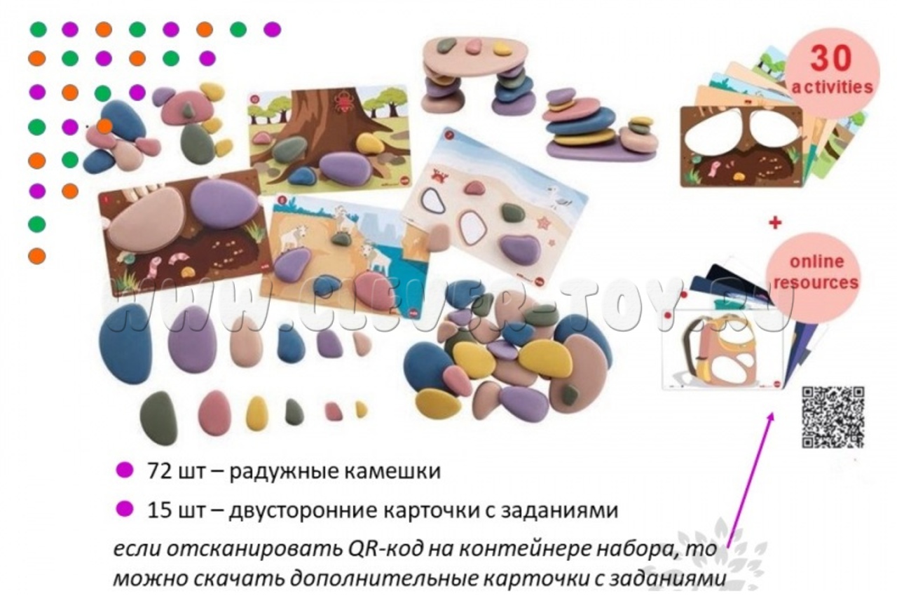 Набор "Радужные камешки" способствует сенсорному, социально-коммуникативному, познавательному, речевому и физическому развитию, а также оказывают положительное влияние на психику ребенка.