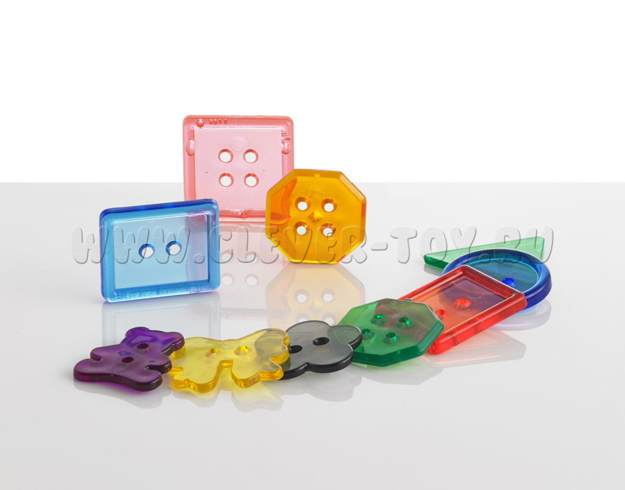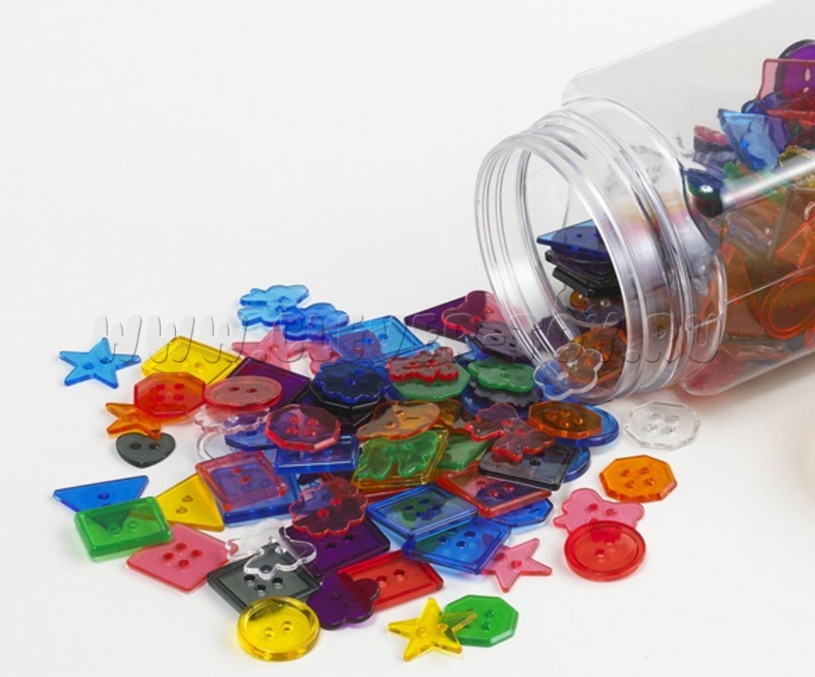 Прекрасный набор цветных прозрачных пуговиц из 11 разнообразных форм размером от 16 мм до 25 мм.