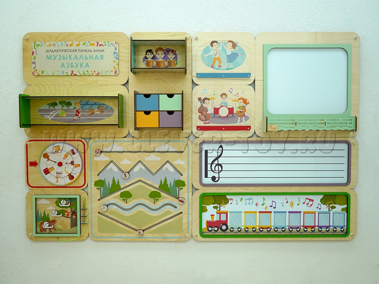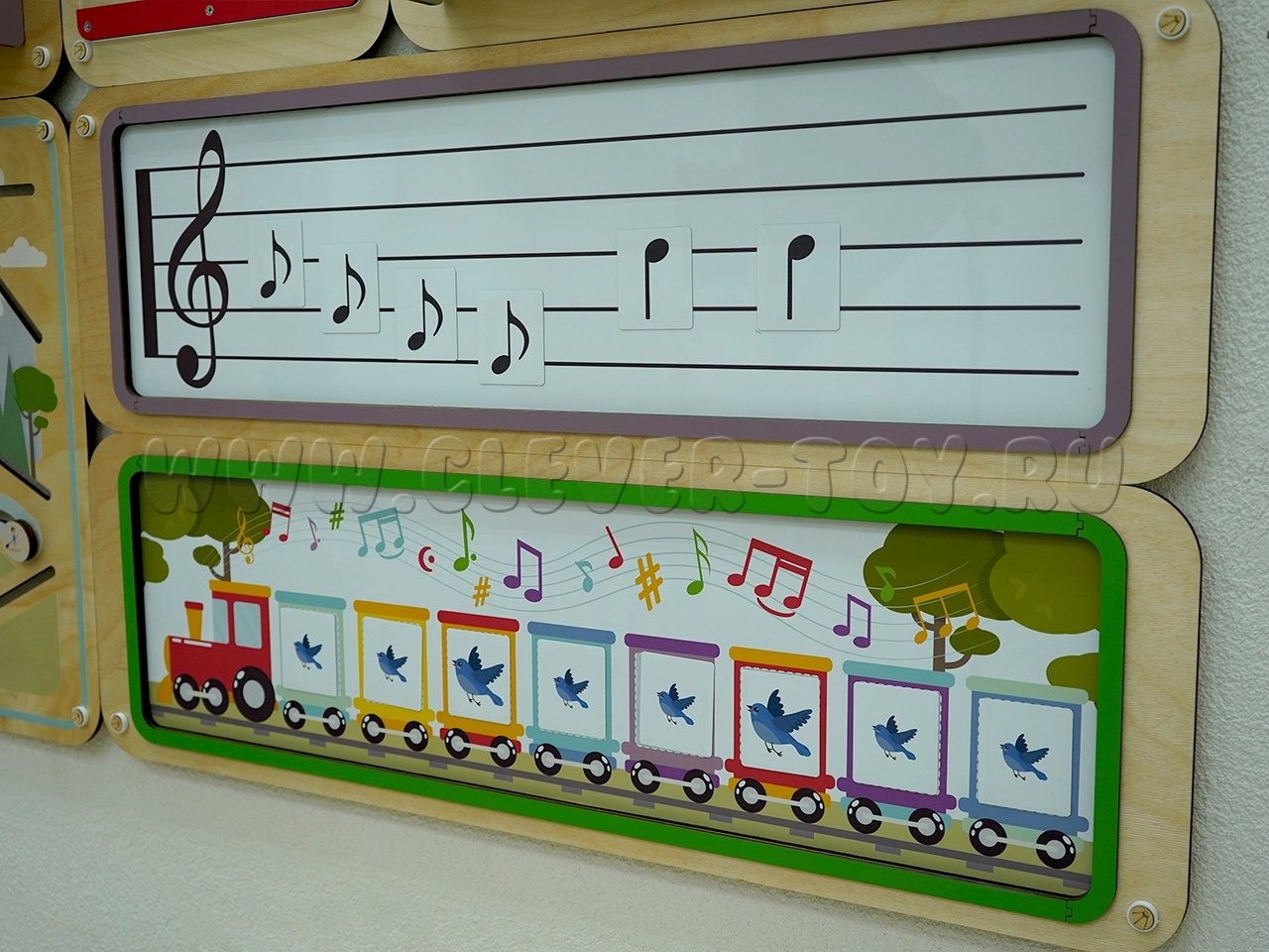 Модуль "Нотки-магнитики" с комплектом магнитов в форме нот знакомит детей со способом записи мелодии и элементарной нотной грамотой. Элемент панели можно использовать для пения, слушания музыки, игры на музыкальных инструментах.