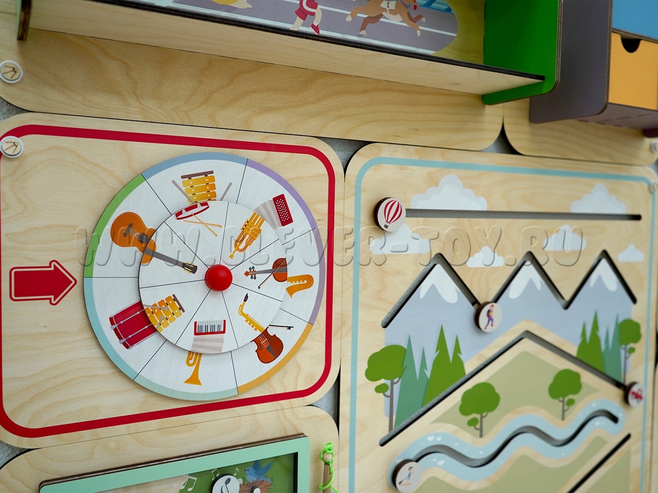 Карусель"Музыкальные инструменты" отображает типичные образцы струнных, клавишных, духовых и ударных инструментов, с которыми дети знакомятся в детском саду. Модуль помогает закрепить полученные знания: оба круга карусели вращаются относительно друг друга, а дети должны выбрать музыкальный инструмент, совместив изображение на внешнем круге со стрелкой и найдя подходящую половинку на внутреннем круге.